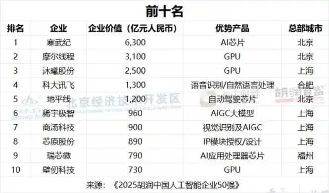 1月19日,胡潤研究院發(fā)布《2025胡潤中國人工智能企業(yè)50強》,榜單聚焦于主營業(yè)務(wù)為AI算力或算法的中國企業(yè),上市公司市值按照1月9日的收盤價計算,非上市公司估值參考同行業(yè)上市公司或者根據(jù)最新一輪融資情況進行估算。這是胡潤研究院第二次發(fā)布該榜單。